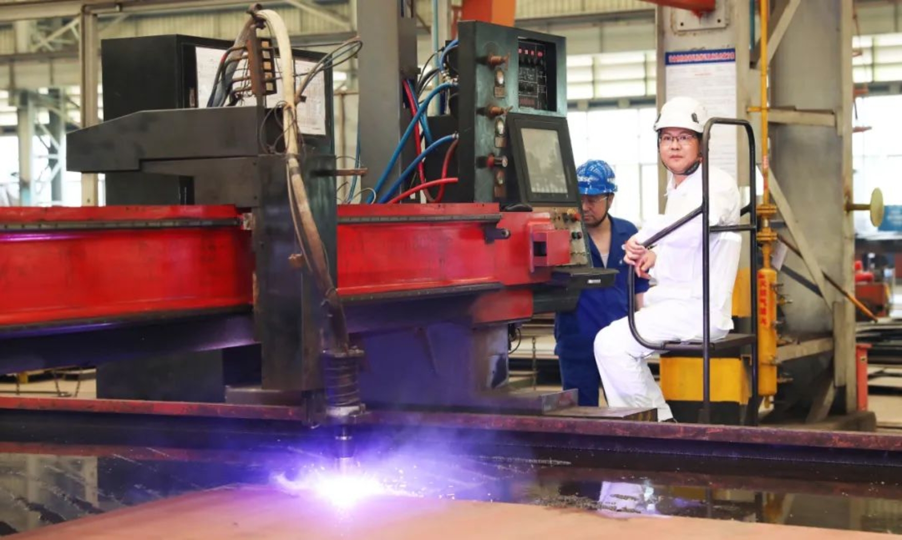 開工儀式上,船東代表蔣祥林先生按下切割機按鈕,切割機徐徐移動,火焰迸發(fā),第一塊鋼板按照圖紙尺寸開始切割,這也標志著公司承接的6艘1100TEU集裝箱船已全部開工。