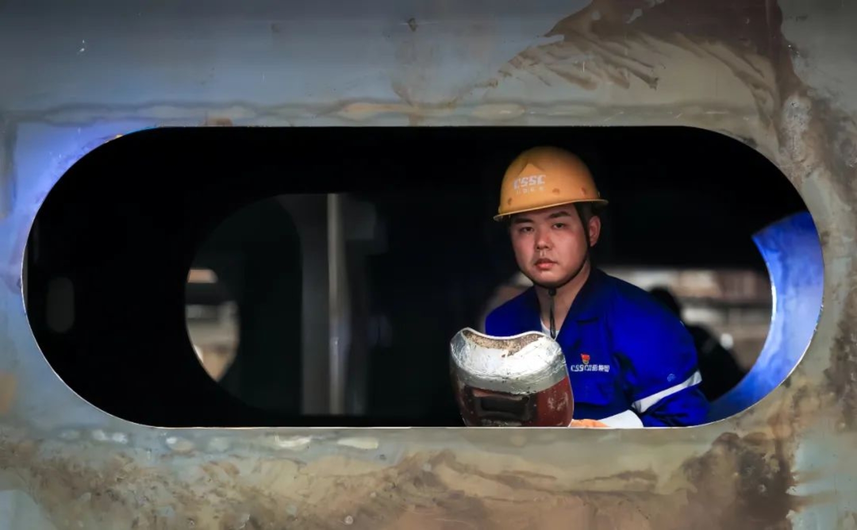 在船臺車間,總能看到一抹深藍(lán)色的身影手持焊槍半蹲半跪,焊接聲“嗞嗞”作響,白色焊煙騰起,焊絲和板件的連接處發(fā)出刺眼的光。
