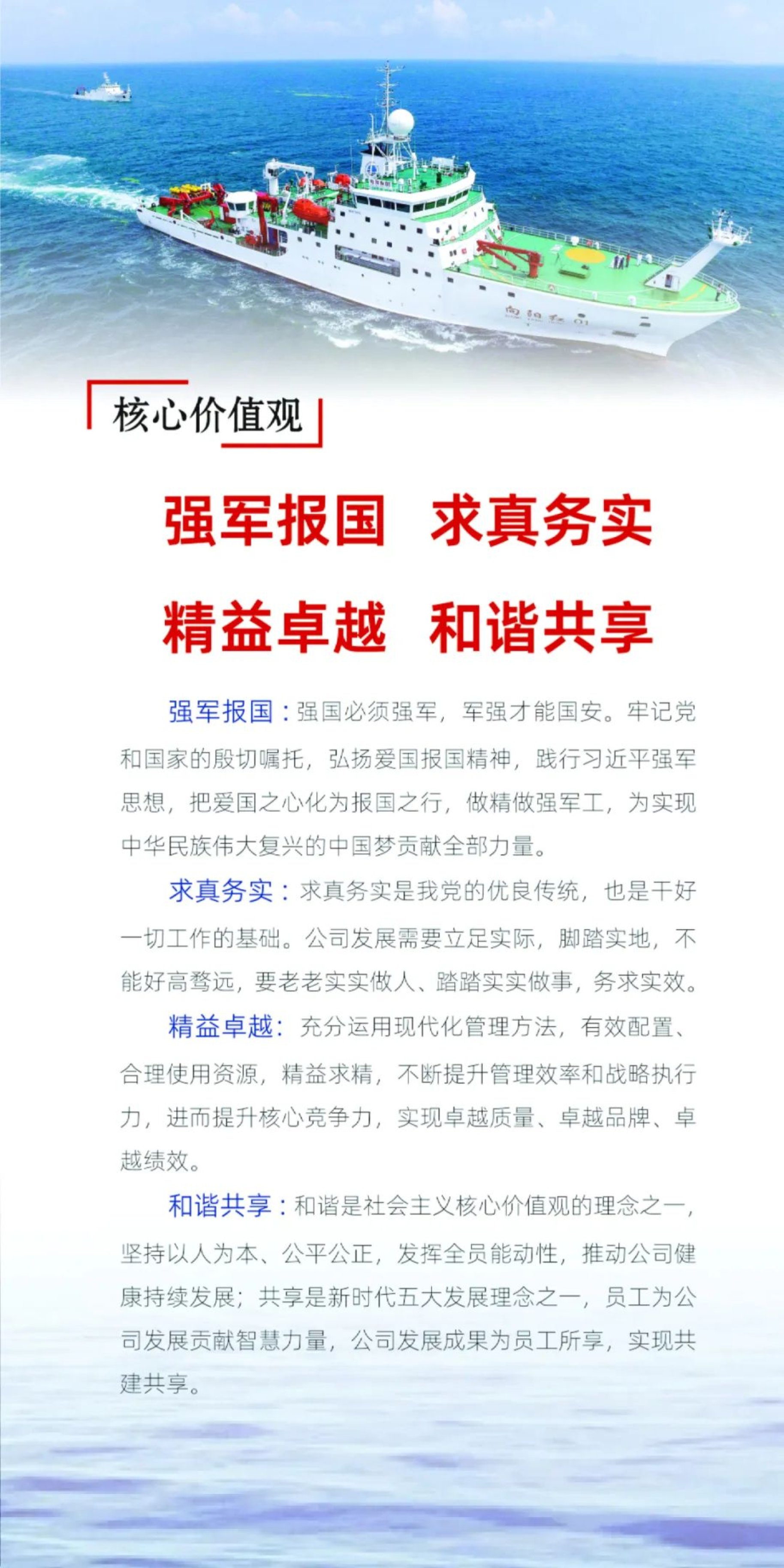新時代召喚新使命,新形勢提出新要求。按照集團公司關于深度學習和弘揚中國船舶三大精神和企業(yè)文化建設工作有關要求,在武昌造船高質量發(fā)展戰(zhàn)略指引下,在公司黨委的高度重視、督導和關切下,歷經追根溯源、問卷調查、征集意見、專題研討等,公司從不斷迭代的企業(yè)文化理念體系中,結合戰(zhàn)略規(guī)劃和發(fā)展實際,形成了2023版《武昌造船企業(yè)文化宣傳冊》,對原有企業(yè)文化八大核心理念和軍工文化進行了融合、精簡、提煉、優(yōu)化,形成了以使命、愿景、精神、核心價值觀、員工行為準則為主的五大核心理念,并賦予了新時代高質量發(fā)展要求下的新內涵。