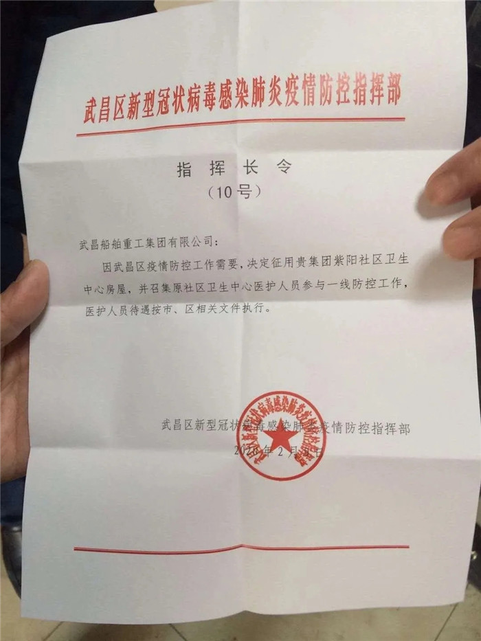 2020年2月9日上午,武船黨委接到武昌區防疫指揮部的指令:為全力支持保障武昌區疫情防控工作,實現應收盡收,區指揮部要求重新啟用原武船中心醫院場地,設置新冠肺炎收治點,同時需召集原中心醫院醫務人員。武船黨委將這個重任交給了田碧武,面對當時嚴峻的新冠肺炎疫情,有著近30年醫務工作經歷的田碧武沒有絲毫猶豫,毅然接受了這項任務。