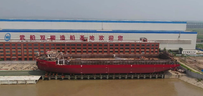 7月24日上午10時(shí)18分,烈日炎炎,彩旗飄動(dòng),由雙柳武船承建的13000DWT甲板運(yùn)輸船最后一艘4號(hào)船在雙柳基地下水。船東代表法國(guó)路易達(dá)孚海運(yùn)集團(tuán)公司艾米力?杜,武昌船舶重工集團(tuán)有限公司副總經(jīng)理田軍,武船集團(tuán)雙柳武船黨委書記、董事長(zhǎng)楊國(guó)平等參加了下水儀式。4號(hào)船的順利下水,標(biāo)志著在雙柳武船全體員工努力下,在設(shè)計(jì)師、工程師和驗(yàn)船師的積極幫助下,13000DWT項(xiàng)目進(jìn)入全面收官的關(guān)鍵沖刺階段。