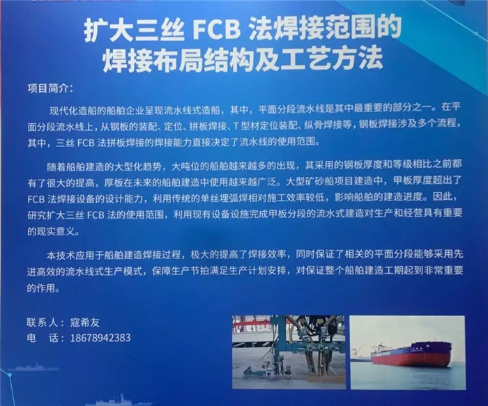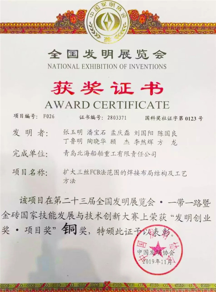 武船集團派出由科技部、戰略部、海工院、重裝公司、北船重工組成的6人小組參加集團公司展團,攜海工院的《一種海洋工程基地客貨后勤保障船》、重裝公司的《一種大型螺桿自驅安裝機》、北船重工的《擴大三絲FCB法焊接范圍的焊接布局結構及工藝方法》三項發明專利在國防知識產權展區進行了展出。