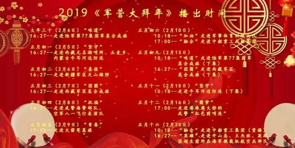 2019年的新春前夕,解放軍新聞傳播中心廣播電視部,再啟《軍營大拜年》為兵服務(wù)的新征程。多支文藝輕騎隊進(jìn)寒區(qū)、入戈壁、上高原、下海防、走邊關(guān)、進(jìn)班排,把軍委的關(guān)懷與問候送到基層,把全國人民的祝福帶給官兵。秉承“真誠為兵服務(wù)、真實(shí)記錄過程”,節(jié)目組把豐富多彩的基層慰問活動,精心制作成為系列節(jié)目,從大年三十到正月十五,每天在央視熒屏上給全軍戰(zhàn)友和電視觀眾拜大年。
