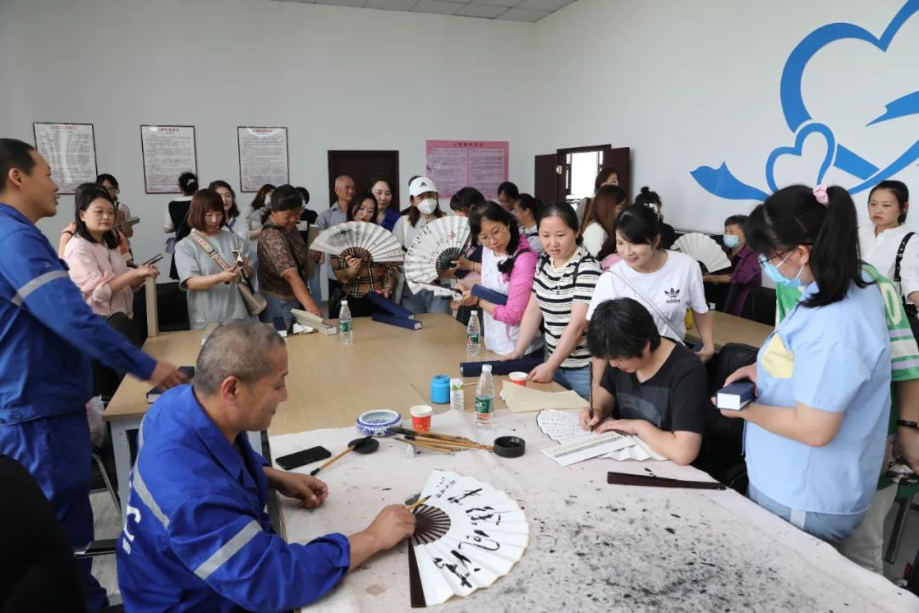 職工家屬參觀職工活動中心,武昌造船書法協(xié)會會員現(xiàn)場創(chuàng)作字畫折扇并贈送職工家屬