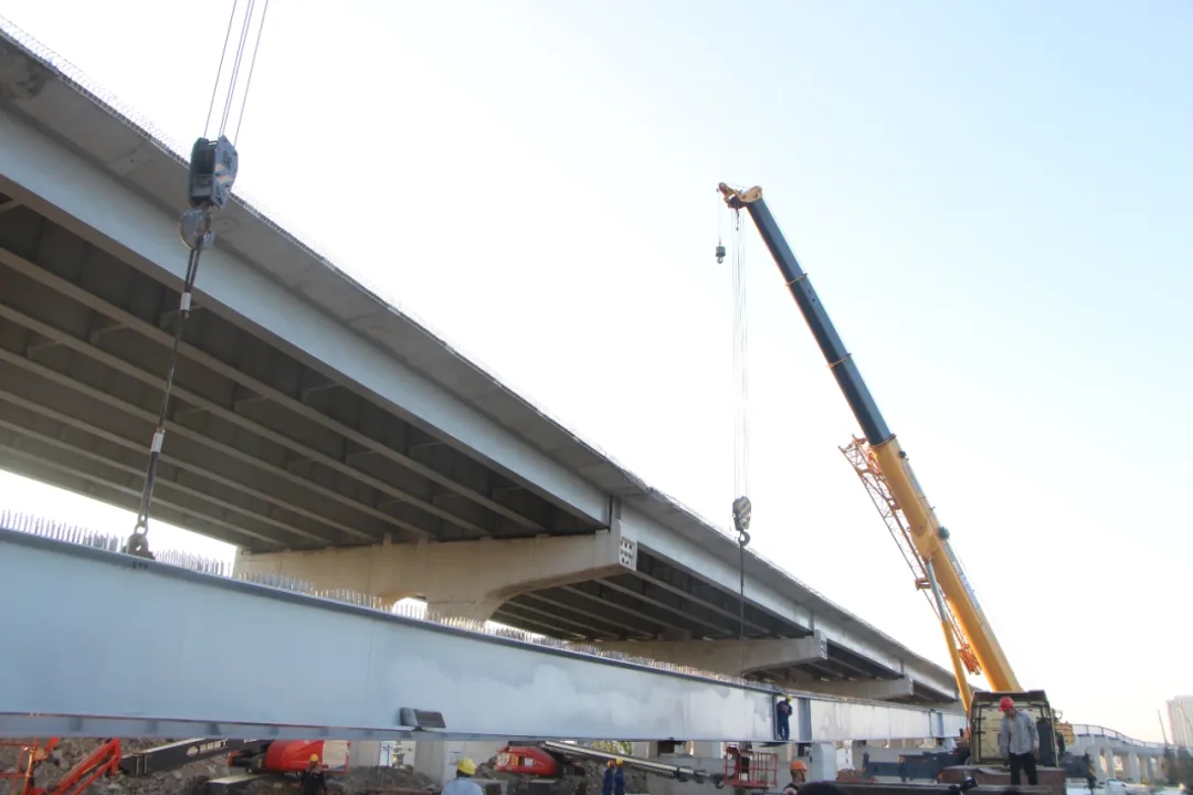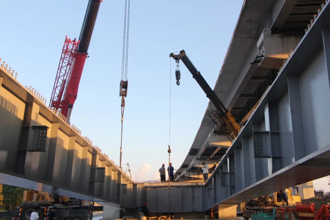 ▲最后一跨鋼板梁架設中