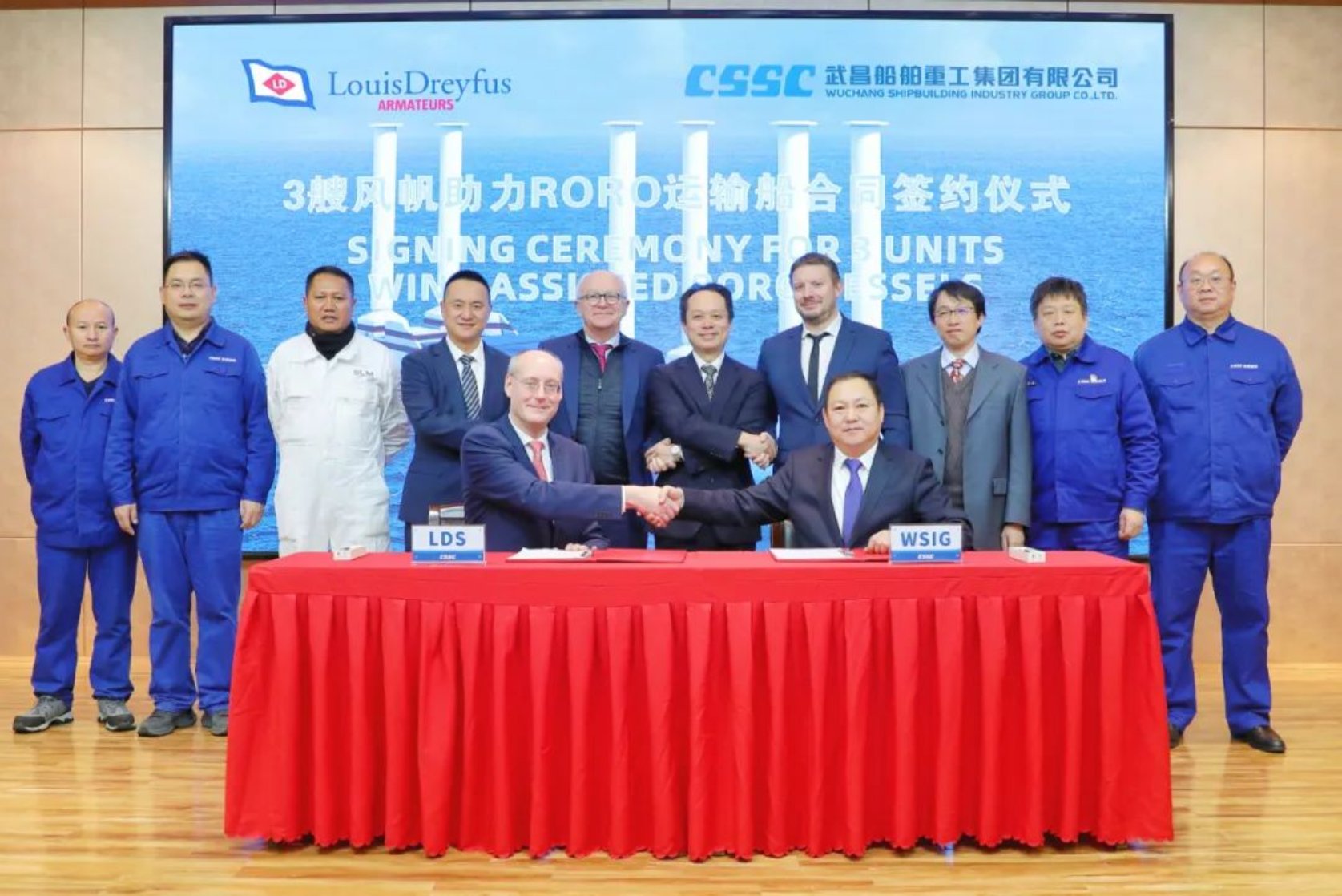 新年開新局,奮斗創佳績!2024年的第一個工作日,中國船舶集團武昌造船迎來首個經營開門紅!武昌造船與長期合作伙伴——法國LDA公司再度牽手合作,和其下屬公司LD SEAPLANE SAS 簽訂3艘風帆助力RORO運輸船建造合同。