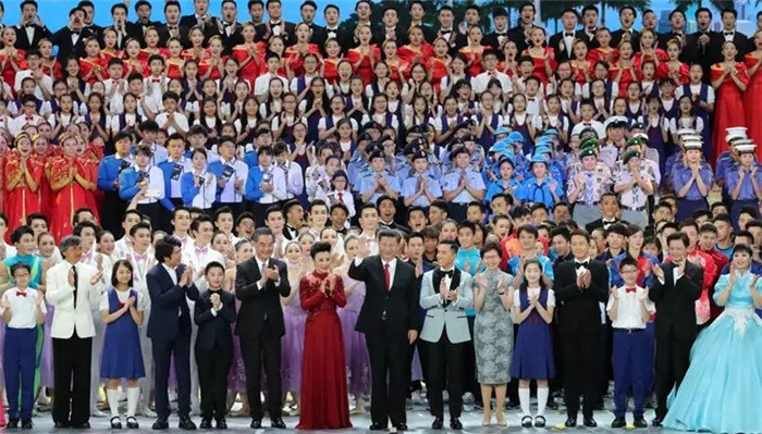▲2017年6月30日晚,習(xí)近平主席在香港會(huì)展中心同全場(chǎng)一起高唱《歌唱祖國(guó)》新華社記者馬占成攝