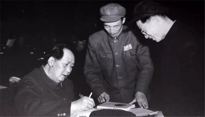 ▲1951年全國(guó)政協(xié)會(huì)議上毛澤東為王莘簽名(右一為王莘)