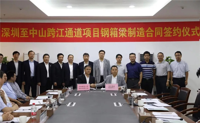 10月29日下午,廣東省深圳至中山跨江通道項目鋼箱梁制造G03標段簽約儀式在中山舉行,武船重型工程股份有限公司(簡稱武船重工股份)總經理吳躍波代表公司與廣東省公路建設有限公司黨委書記、董事長王康臣在合同文本上簽字,武船集團黨委書記、董事長陳?劍?黨委委員、副總經理田軍,武船重工股份總工程師阮家順,常務副總經理李立明出席簽約儀式。