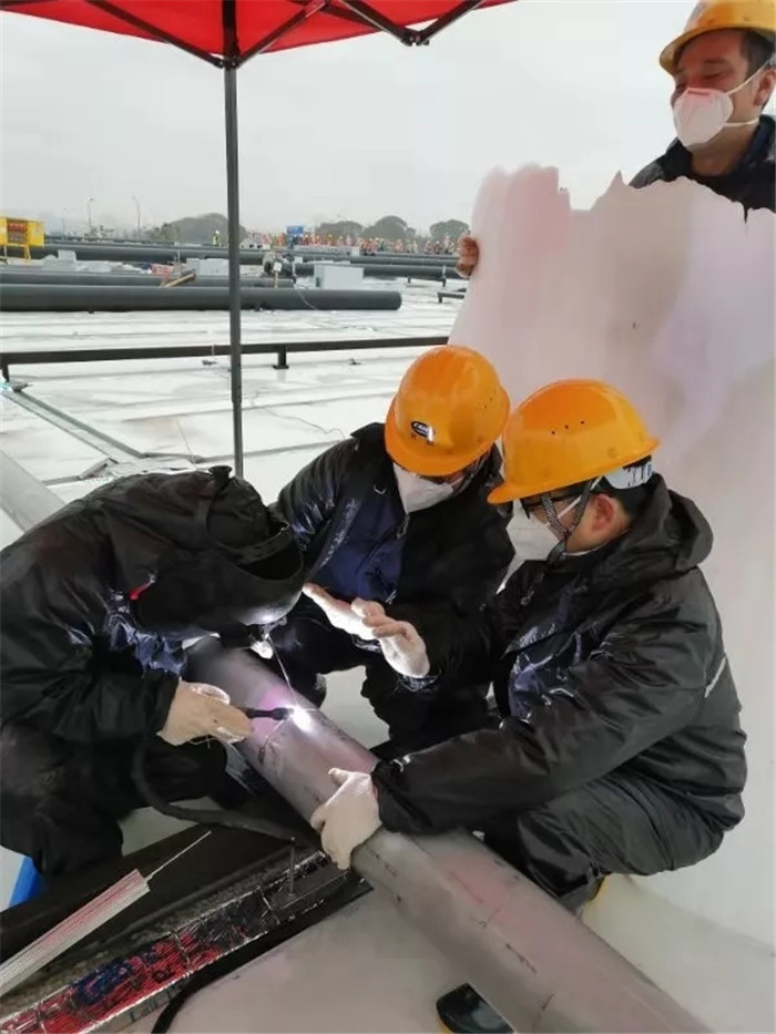 △雷神山醫院頂樓天臺現場冒雨施焊接作業