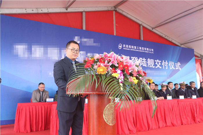 該國(guó)海軍參謀長(zhǎng)一行、中船重工武船集團(tuán)副總經(jīng)理姚勝華及國(guó)內(nèi)相關(guān)單位領(lǐng)導(dǎo)參加了交船儀式。