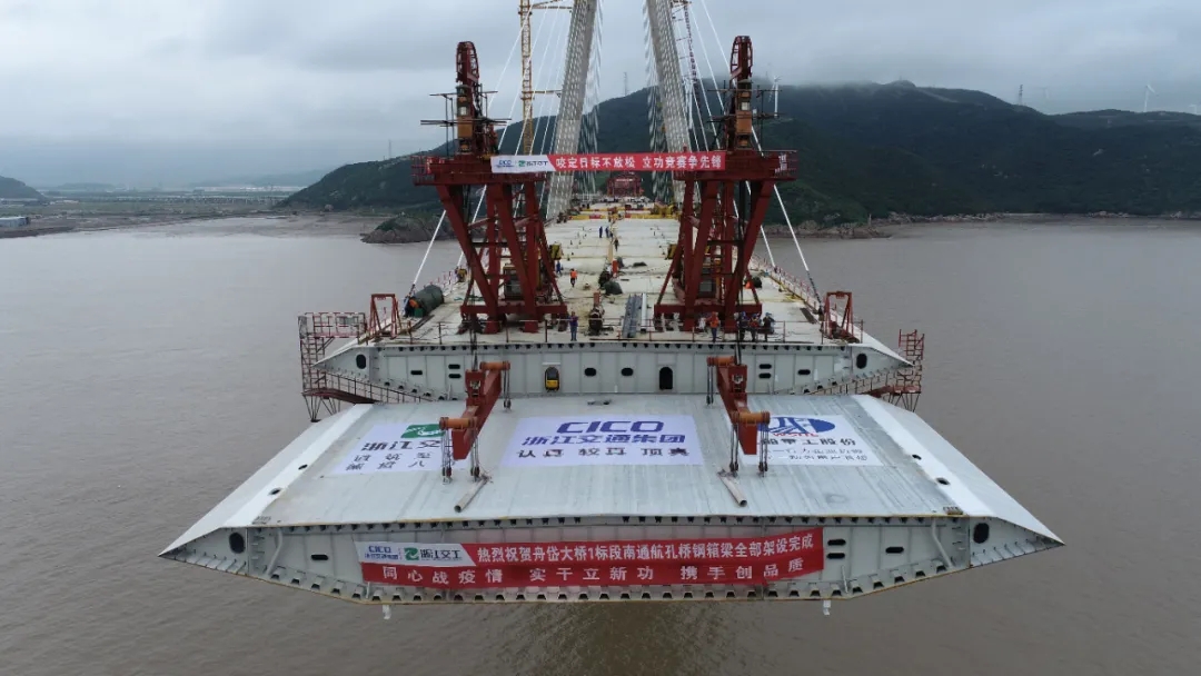 6月22日,中國船舶武船集團武船重工股份承建的舟岱大橋DSSG01標南通航孔橋最后一節(jié)鋼箱梁吊裝完成,精準落位,南通航孔橋率先實現(xiàn)邊跨合龍,較計劃合龍時間節(jié)點提前了6天。