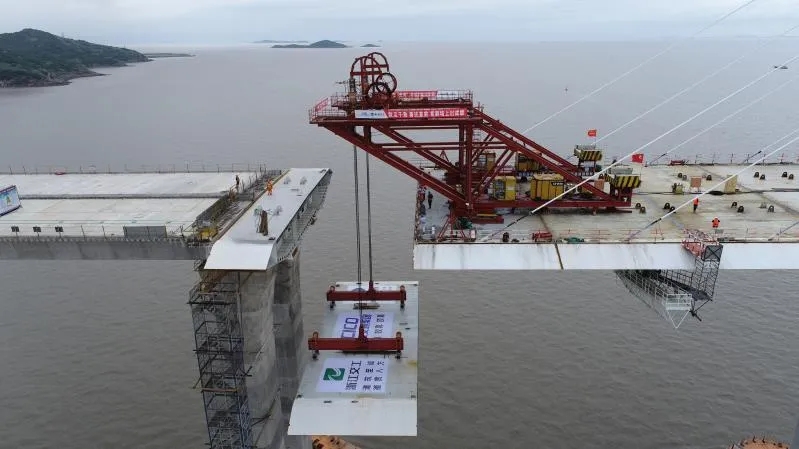 舟岱大橋DSSG01標南通航孔橋跨中節(jié)段吊裝
