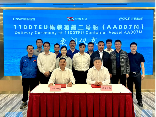 4月25日,由中國船舶集團武昌造船為CA SHIPPING建造的 1100TEU集裝箱船2號船 提前交付!該船的提前交付是武昌造船步入“快車道”,跑出“加速度”的成果體現(xiàn),展現(xiàn)了公司在設(shè)計和建造方面的綜合實力,也為武昌造船建廠90周年獻上的一份沉甸甸的賀禮!武昌造船、亞海航運、NK船級社、哥倫比亞船舶管理公司等相關(guān)單位領(lǐng)導和嘉賓共同見證交付儀式。
