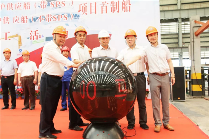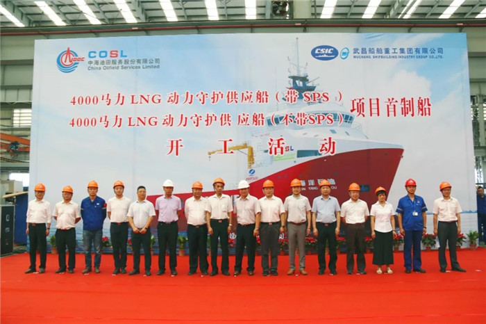 2019年7月30日上午10點08分,中海油服兩型八艘4000馬力LNG動力守護供應船首制船開工儀式在武船集團船舶公司六連跨內業車間舉行。中海油田服務股份有限公司船舶事業部副總經理蔡鈿,中國船級社武漢分社副總經理余德斌,上海佳豪船海工程研究設計有限公司院長秦炳軍,武船集團經濟運行部、質量部、安保部、規劃部、船海設計公司及船舶公司相關單位領導參加了此次活動。
